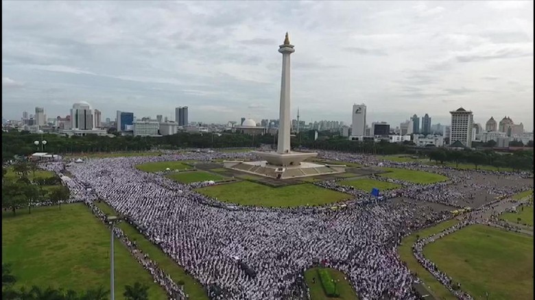 Peserta doa bersama 2 Desember memenuhi Lapangan Monumen Nasional (Monas) sejak subuh. Mereka datang dari segala penjuru arah.